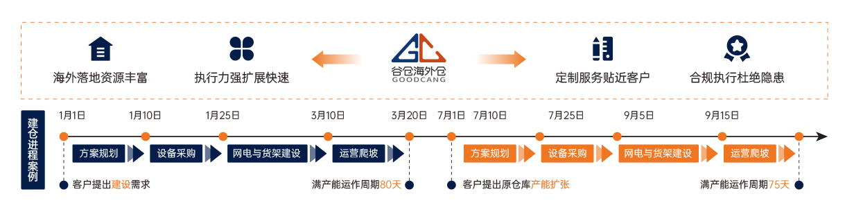 對接客戶全球化市場拓展及個性化倉配的需求,谷倉海外倉利用15年185萬平海外倉運營經驗和先進的智能倉配技術資源,結合平臺官方運營、大客戶倉代運營和品類專倉的服務需要,依托自主研發的GD、ELD等系統,定向提供流程優化團隊支持,進行專業合規的倉庫選址規劃與建設,實施標準化建倉管理流程。根據客戶真實建倉需求或產能擴張計劃,滿產能運作75-80天即可實現「方案規劃-設備采購-網電與貨架建設-運營爬坡」建倉全流程。在提升整體建倉作業效率的同時嚴格把控全流程成本,助力客戶出海業務精細化、數字化發展,構建互通互聯、高效協同的供應鏈生態。